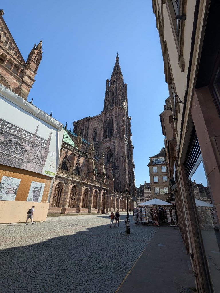 Wir beginnen unsere Stadtbesichtigung im Herzen von Straßburg und unser Weg führt uns direkt zum imposanten Straßburger Münster, das schon von weitem über der Stadt thront. Mit seinem filigranen Turm und der detailreichen Fassade zählt es zu den bedeutendsten gotischen Bauwerken Europas und prägt das Stadtbild wie kein anderes Gebäude.