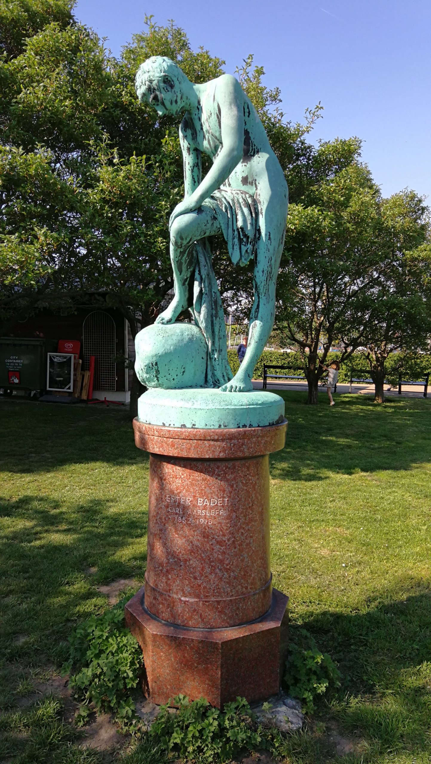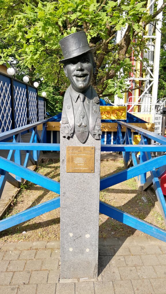 Foto, Quelle Wikipedia: Professor Tribini (Büste von Troels Lybecker, im Außenbereich von Bakken, an der Stelle, wo „Professor Tribini“ früher sein Varietézelt hatte; Kopenhagen, 2008)